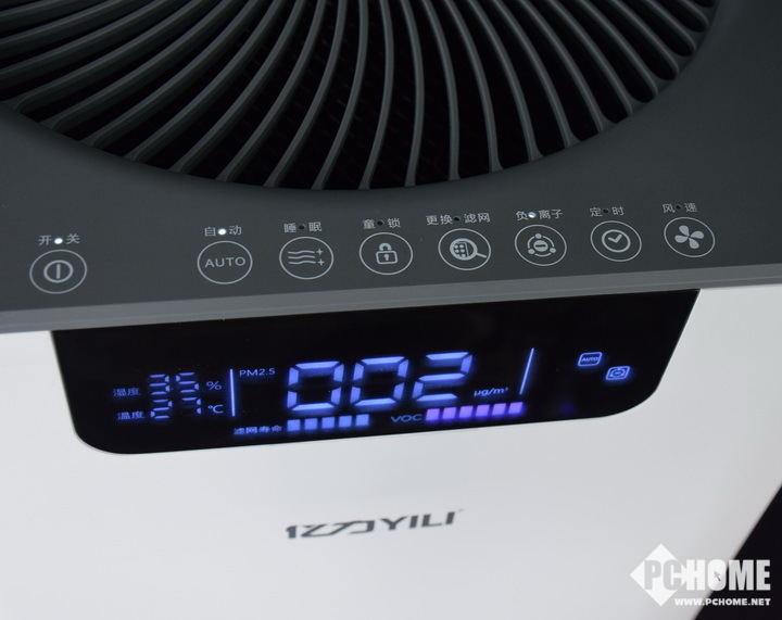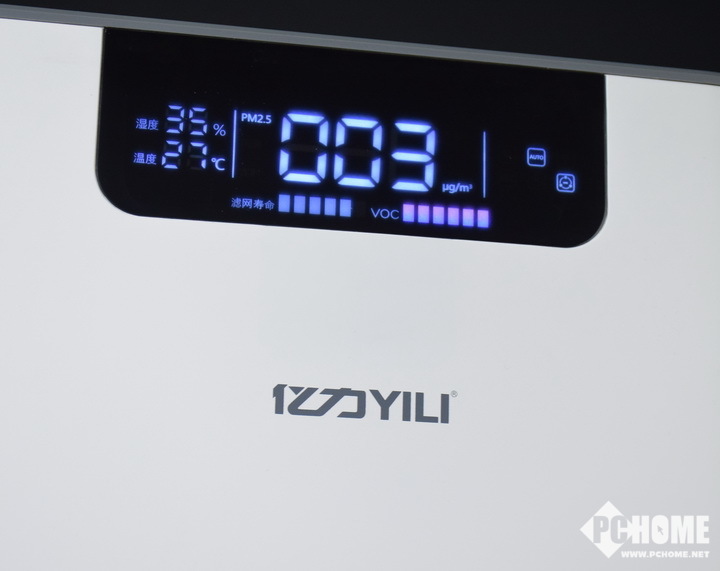 屏幕上可以显示是当前环境的PM2.5指数、室内温湿度、正在运行的功能,空气净化器的运行状态可以说是一目了然,值得一提的是在屏幕内容中还加入了滤网使用寿命和室内VOC浓度的检测。这在当前以PM2.5检测为主的空气净化器行业中可谓是一种绝无仅有的创新。