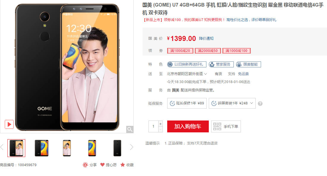 全面屏设计国美U7 三重生物识别
