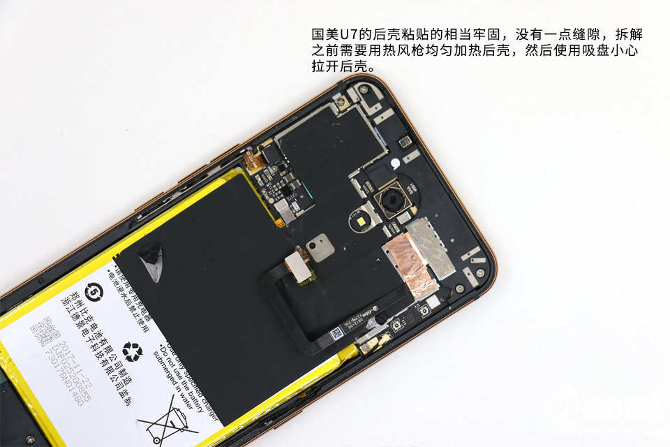 国美U7的后壳粘贴的相当牢固,没有一点缝隙,拆解之前需要用热风枪均匀加热后壳,然后使用吸盘小心拉开后壳。