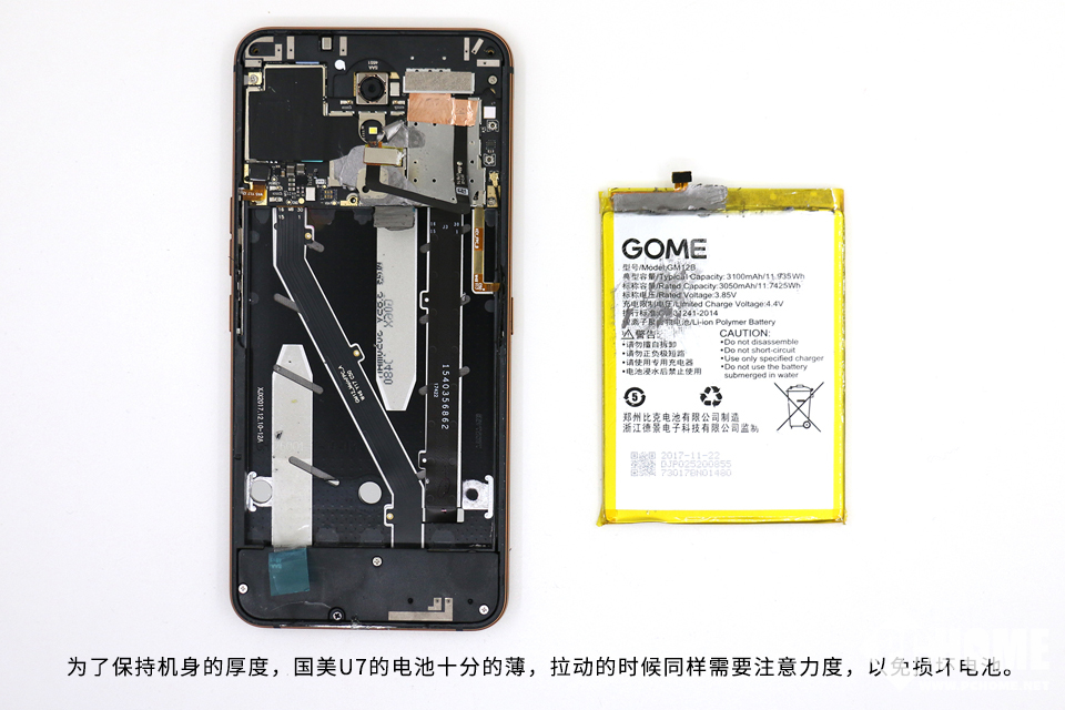 为了保持机身的厚度,国美U7的电池十分的薄,拉动的时候同样需要注意力度,以免损坏电池。