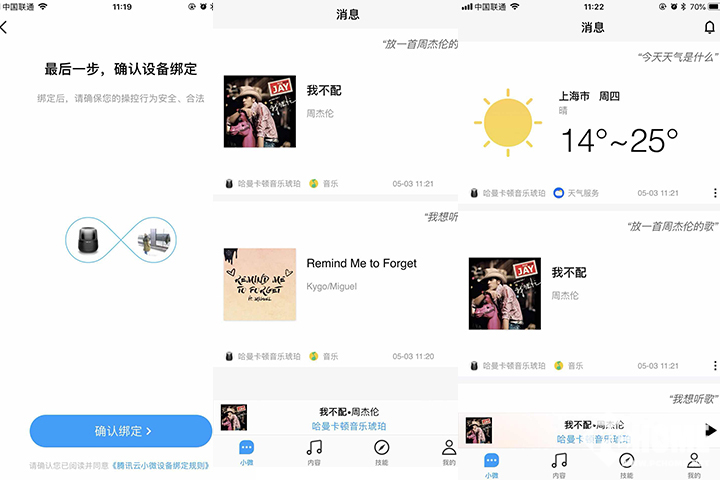 绑定成功后,即可进行下一步语音操作。音乐琥珀的唤醒词是“嗨,小微”,因为背靠强大的腾讯内容源,所以不用担心版权问题。我只需对音乐琥珀说出“嗨,小微,我要xxxx”,就能体验有声读物、新闻、笑话、天气等服务,其中包括企鹅FM和百科全书。重要的是可以享有QQ音乐中超过40家合作唱片公司的1700万首正版歌曲。