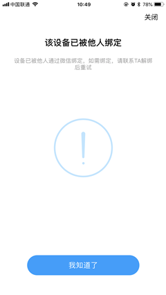 因为我手中这台设备之前被其他小伙伴绑定过,所以在联网成功后遇到了这种情况,但也不要担心,有两种解决办法,一是让绑定好的小伙伴通过腾讯云小微APP解除绑定,二是让重置按钮发挥作用恢复出厂设置。