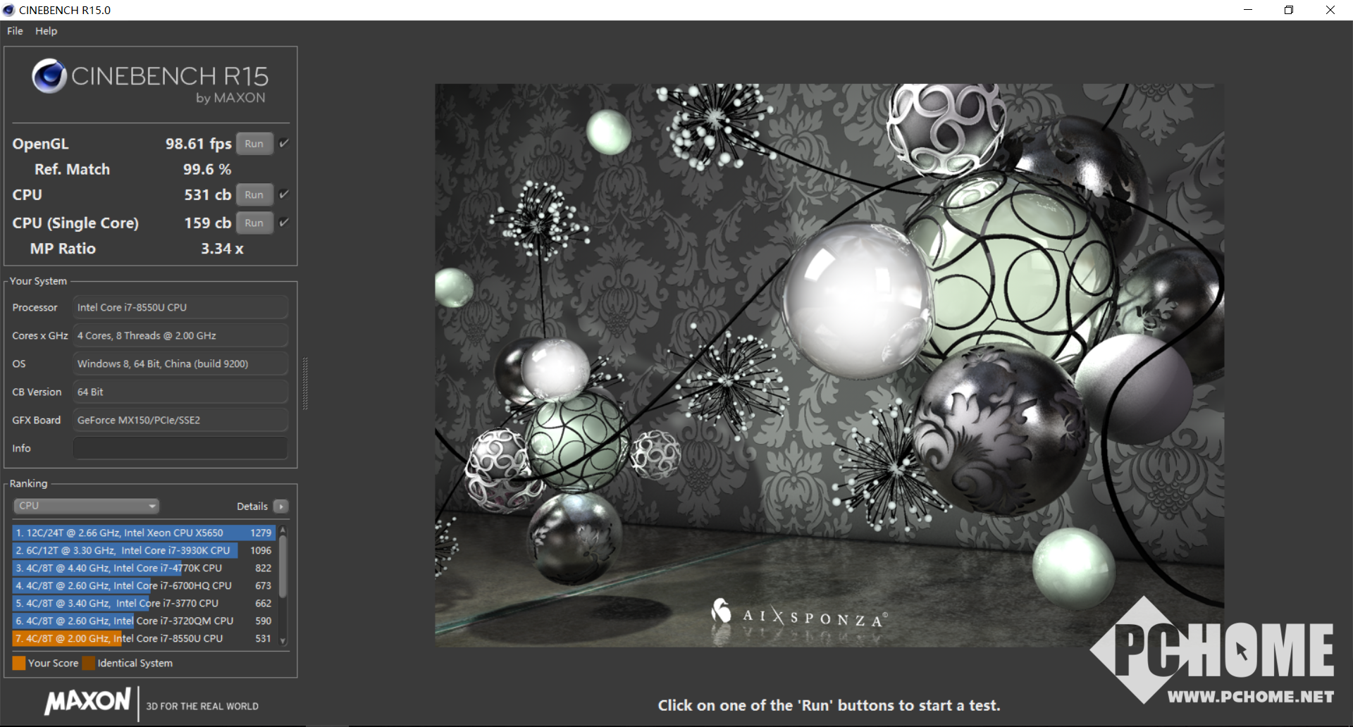 笔者通过CINEBENCH R15来测试处理器性能,联想小新Air 14的CINEBENCH R15最终测试结果为:OpenGL为98.61fps,CPU多核成绩为531cb,单核成绩为159cb,整体性能较上一代同级别产品提升30%-40%,多核多线程的运算性能也提升了一个档次。不得不说,i7-8550U通过实际的跑分颠覆了我们对低电压处理器的认知,低电压处理器仍具有非常大的性能提升空间。