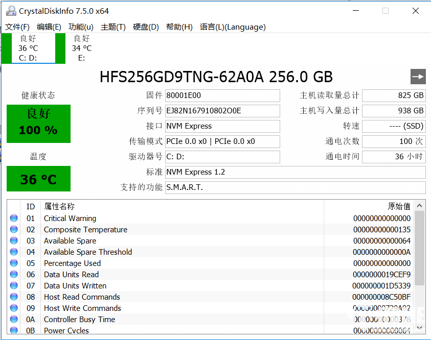联想小新Air 14搭载了一块256GB PCIe SSD,通过CrystalDiskInfo 7.5.0软件检测,该固态硬盘采用了NVMe协议,走PCIe通道。