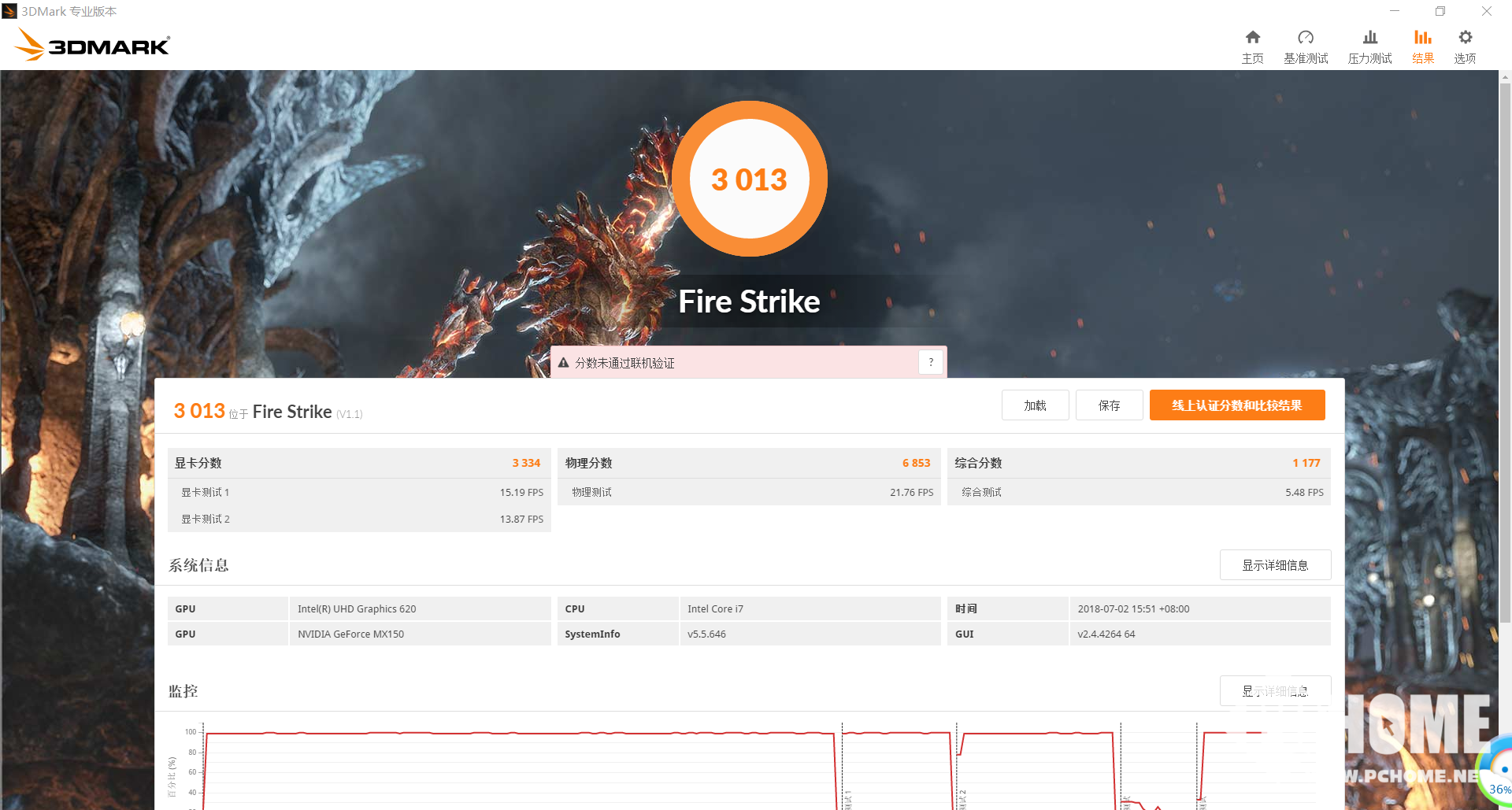 3D MARK测试前,我们提前通过FN+Q组合键将该轻薄本的模式切换至高性能模式,随后进行Fire Strike测试。从测试结果来看,该轻薄本跑出了3013的成绩,也就是说,如果用它来跑一些主流的网游还是相当流畅的,当然,你想用它来玩一场紧张刺激的吃鸡游戏也不是不可以,只是画质需要调低不少。