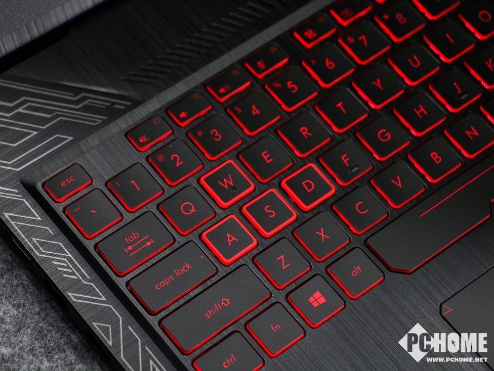 除了A面的精细打磨,C面的面板也加入了拉丝工艺和电路花纹设计,向正中央蔓延的电路纹理使得整个C面尽显科技感,拉丝工艺让键盘掌托的触感更加细腻而舒适。C面的键盘也采用了全新设计,键位布局方面,该笔记本的WASD四键镶了粗红边,视觉上更加醒目,让玩家在游戏时更加快速、精准定位键位。空格键的不规则面积让左手接触空格的面积增大,游戏时操作手感更加出色。整块键盘配以红色背光,与笔记本信仰Logo形成呼应,保证整体红+黑的霸气基调。