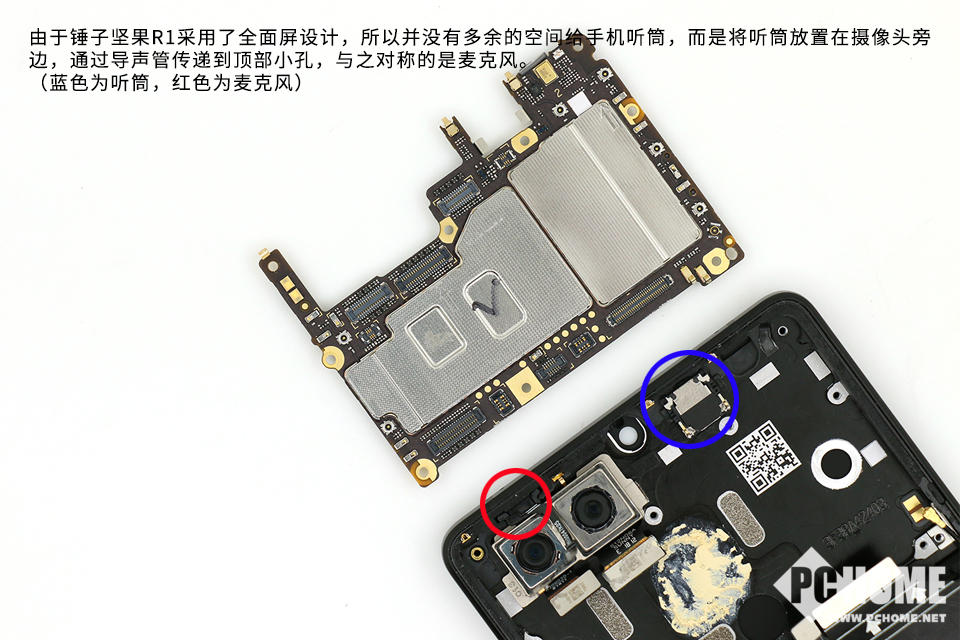 由于锤子坚果R1采用了全面屏设计,所以并没有多余的空间给手机听筒,而是将听筒放置在摄像头旁边,通过导声管传递到顶部小孔,与之对称的是麦克风。(蓝色为听筒,红色为麦克风)