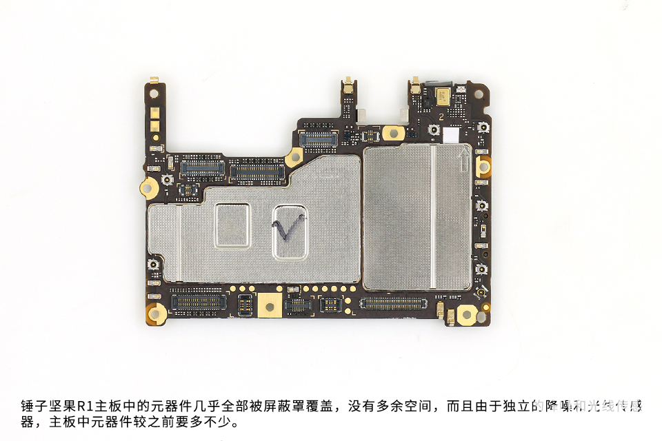 锤子坚果R1主板中的元器件几乎全部被屏蔽罩覆盖,没有多余空间,而且由于独立的降噪和光线传感器,主板中元器件较之前要多不少。