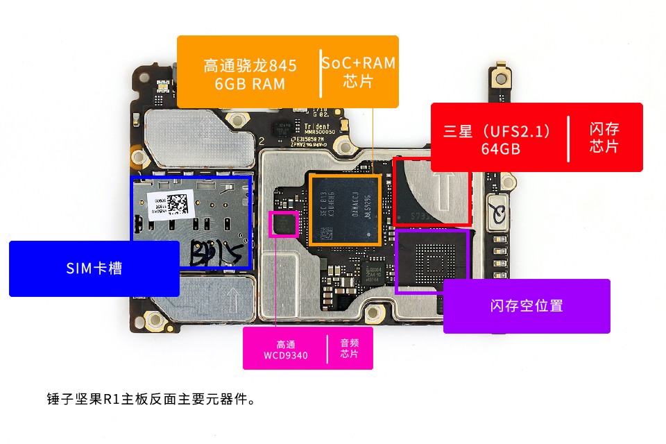 锤子坚果R1主板反面主要元器件。