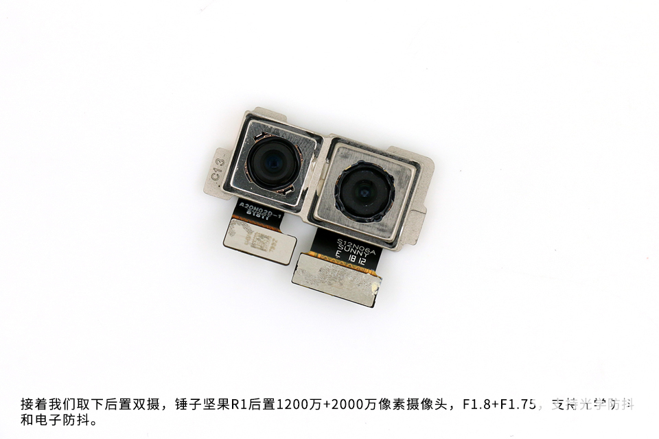 接着我们取下后置双摄,锤子坚果R1后置1200万+2000万像素摄像头,F1.8+F1.75,支持光学防抖和电子防抖。