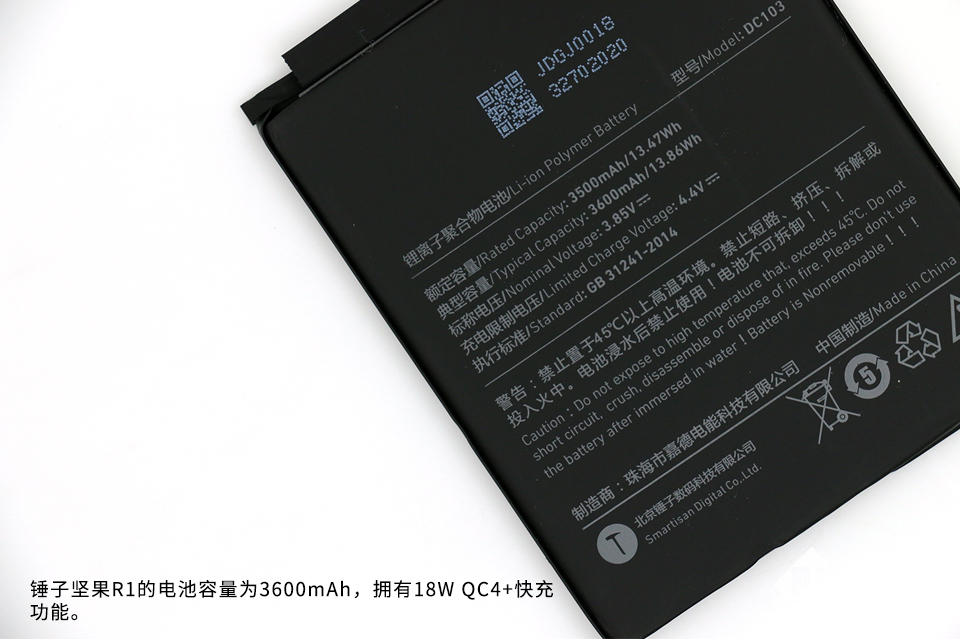 锤子坚果R1的电池容量为3600mAh,拥有18W QC4+快充功能。