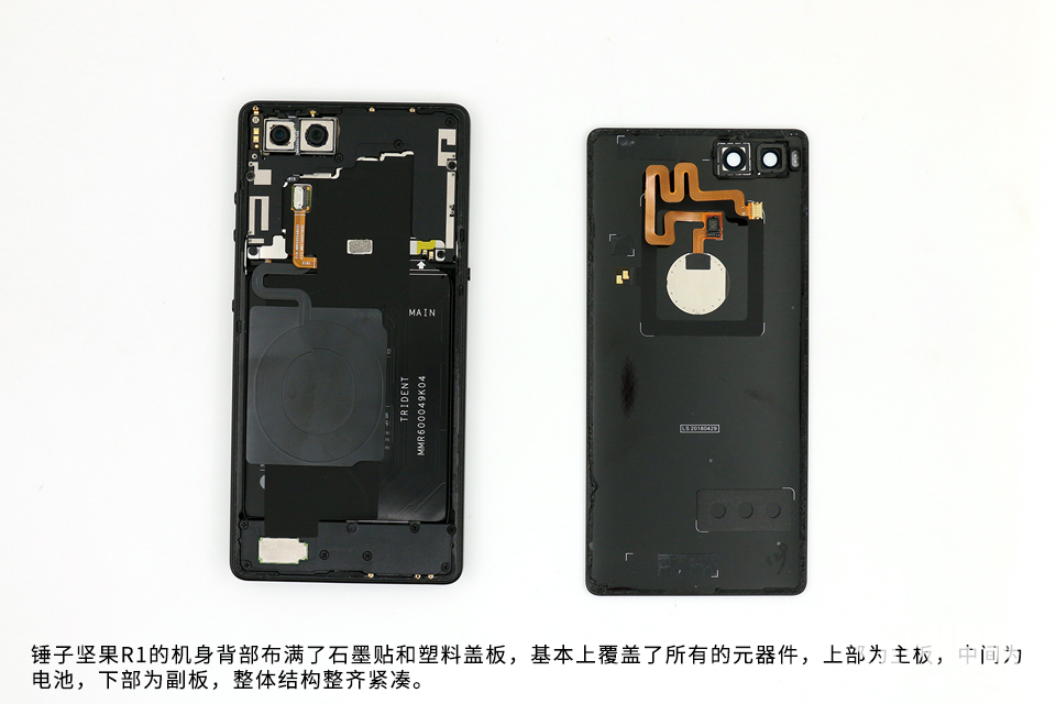 锤子坚果R1的机身背部布满了石墨贴和塑料盖板,基本上覆盖了所有的元器件,上部为主板,中间为电池,下部为副板,整体结构整齐紧凑。