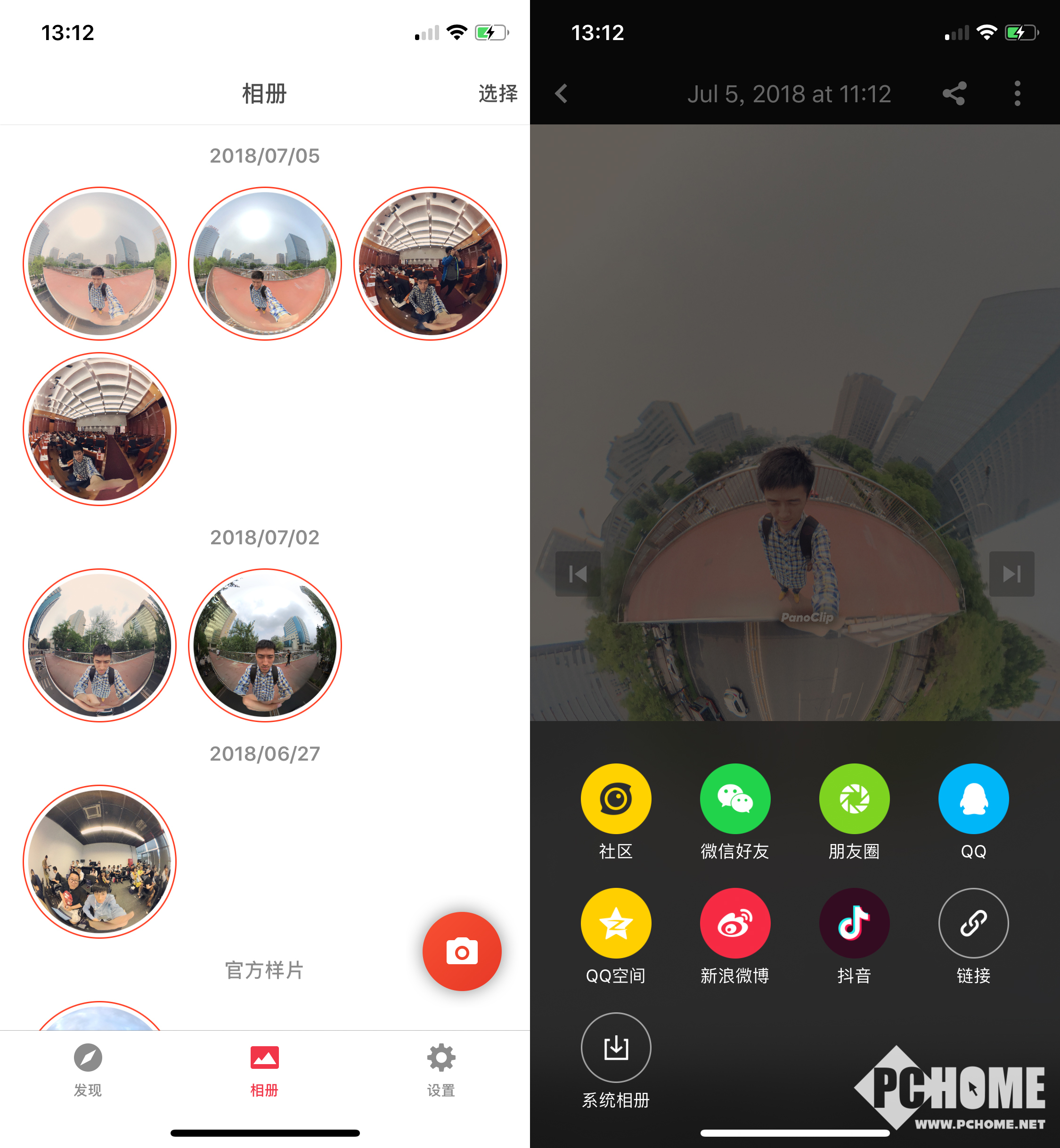 PanoClip全景镜头需要借助同名的“PanoClip”App来使用,打开App后,用户可以看到来自世界各地的用户分享的VR照片,同时相机会自动开启软件算法从而将手机前后镜头中的内容进行拼接。