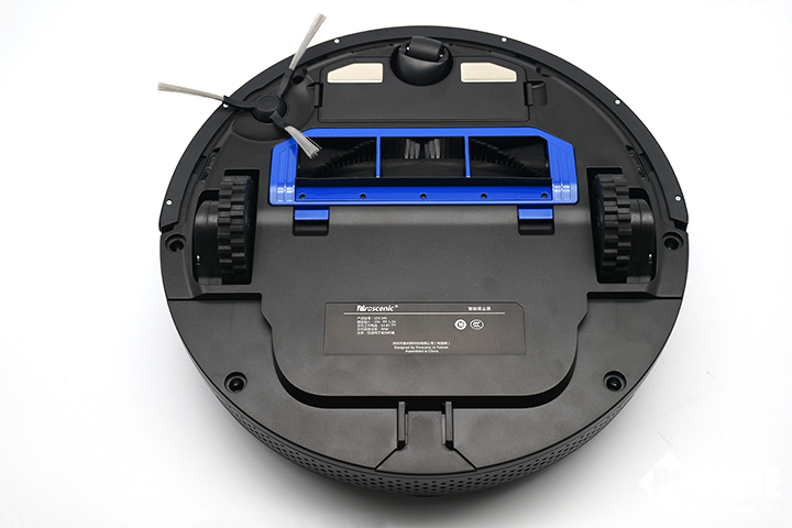 这款扫地机器人的底部造型比较中规中矩,万向轮、驱动轮、悬崖传感器、充电电极等组件都按部就班地分布其中,需要拖地时,湿拖组件能非常方便地进行安装。不过小编发现这款机型只配置有一枚边刷,这样的改变对清扫效果会不会有影响呢?让我们在试用环节一探究竟吧。