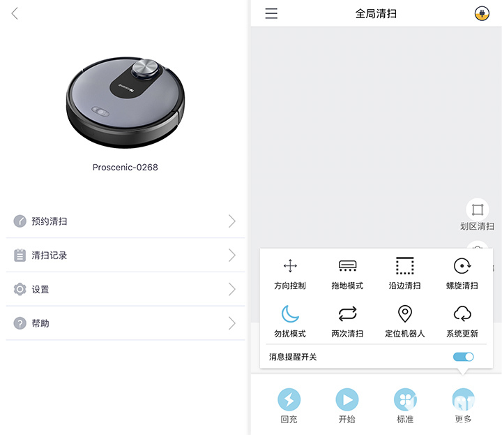 在配套的手机APP上,我们不仅可以让扫地机器人进入常规清扫、延边清扫、螺旋清扫等各种等预设清扫模式,还能控制扫地机器人行进的方向,对特殊区域进行着重清扫。上班族白天经常不在家,可以在前一天预约清扫,晚上回家后查看清扫记录,再控制扫地机器人进行补漏,非常方便智能。