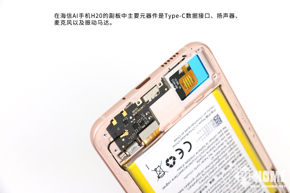在海信AI手机H20的副板中主要元器件是Type-C数据接口、扬声器、麦克风以及振动马达。