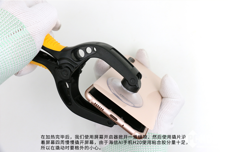 在加热完毕后,我们使用屏幕开启器掀开一道缝隙,然后使用撬片沿着屏幕四周慢慢撬开屏幕,由于海信AI手机H20使用粘合胶分量十足,所以在撬动时要格外的小心。