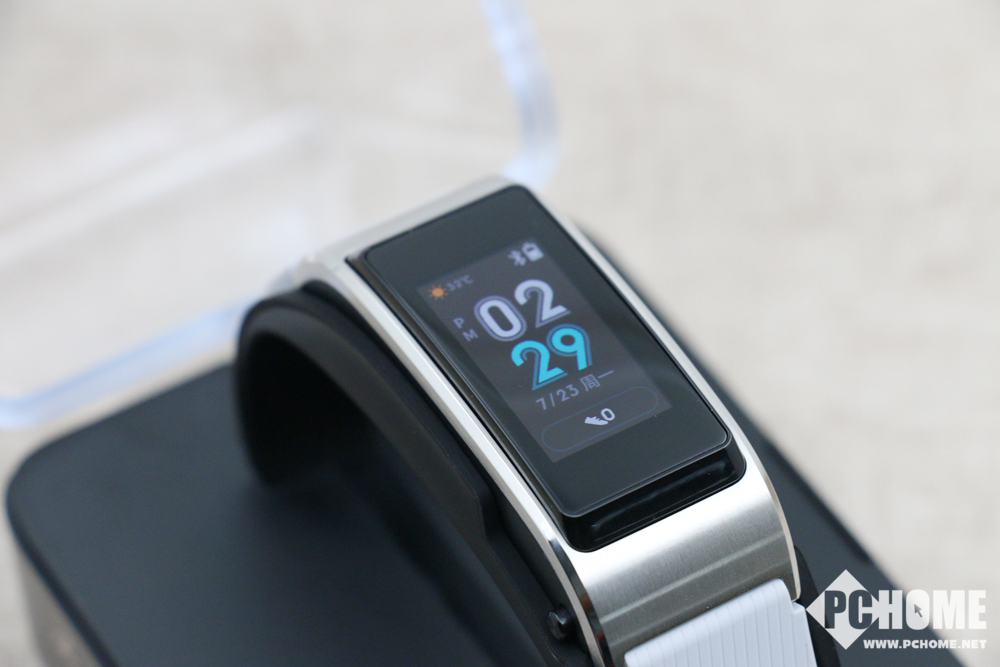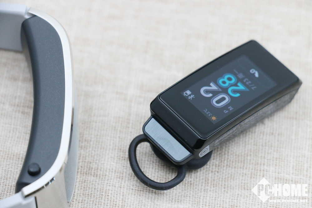 手环弹起后,即可将其取出作为蓝牙耳机使用,此时。不过,由于收纳的需要,华为手环B5的耳塞被压扁是难以避免的,因此在取出后往往需要用手指对其稍加调整才能很好地佩戴到耳朵上。佩戴后心率监测模块会朝向面部,屏幕部分朝外,不会影响美观。