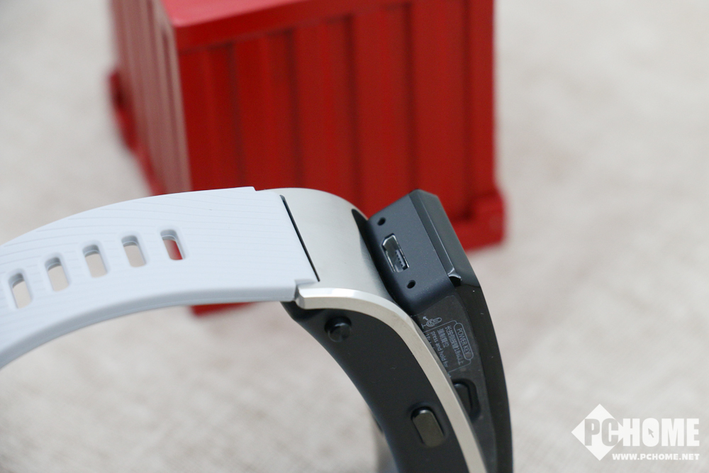 手环的右侧配有一颗按键,用于解锁/锁定屏幕或回到主页面,而在手环底部的两端提供了一组用于拆卸的按钮,按下后手环主体部分的一端会自动弹起,可以看见用于充电的micro USB接口。