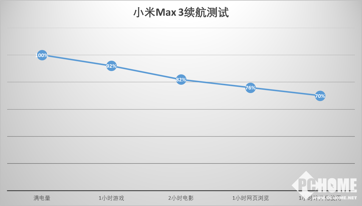 除了极具冲击感的视觉感受外,小米Max 3的第二项独门绝活就是无与伦比的续航能力了。该机在续航上的其实没有丝毫神秘可言,就是简单粗暴的配备了一块5500mAh的海量电池。我们需要注意的是,小米Max 3是在与小米Max 2几乎相同的体积下提升的电池容量,而且厚度还控制在了7.99毫米,这可以说是惊人的设计了。大电池带来的续航提升是立竿见影的,小米Max 3在连续5小时的高强度使用下,还能够剩下70%的电量,用起来根本毫无压力,它是真正的可以使用1天不充电的手机。另外小米Max 3在使用时非常让人有安全感,即使在15%的低电量之下也丝毫不会让用户紧张,因为此时小米Max 3还能进行至少1个多小时的高强度使用。
