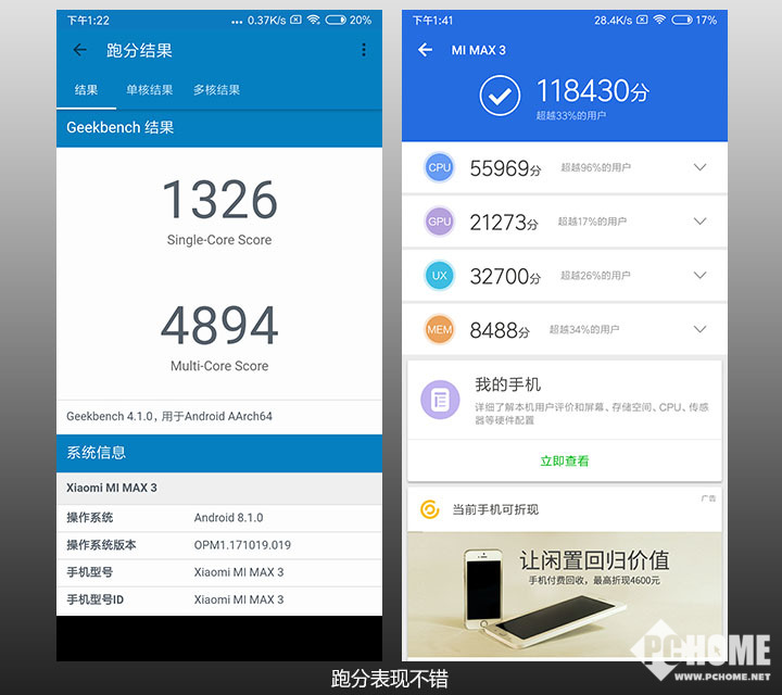 骁龙636的整体性能表现不错,我们甚至可以把它看做是骁龙660的降频版本,通过跑分就能了解到它的强大。GeekBench至关重要的单核得分1326分,安兔兔跑分接近12万分,性能上是比较不错的中端表现。
