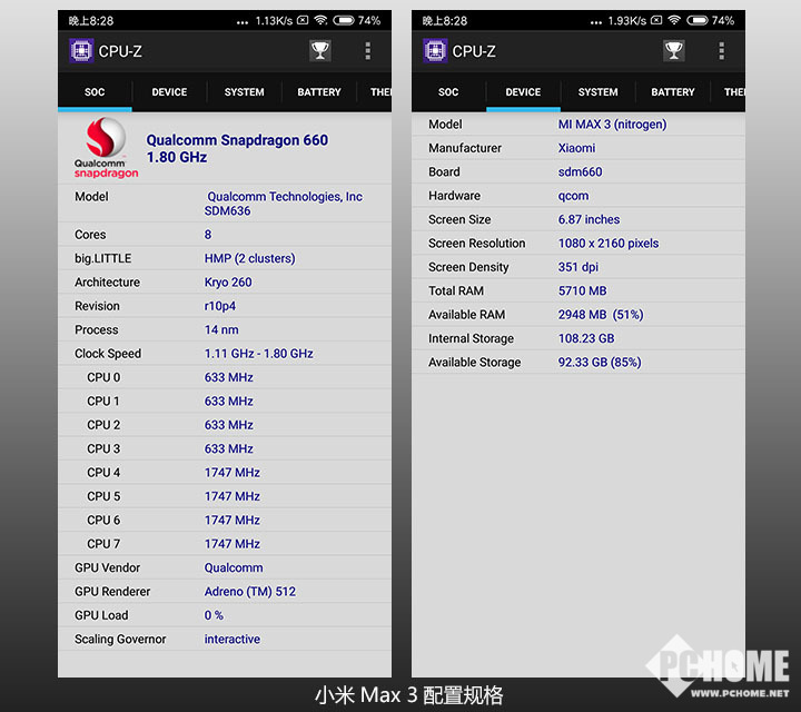 处理器方面,小米Max 3使用的是高通骁龙636处理器,它采用了14nm工艺打造,架构上是与骁龙660相同的Kryo架构,采用大核+小核的设计,只是在大核的主频上从2.2GHz下降到1.8GHz,因此在性能上与前代有着巨大的提升,即使与骁龙660相比也没有很大的性能差距。图形方面采用Adreno 509 GPU,性能比起前一代只要也有40%的提升。