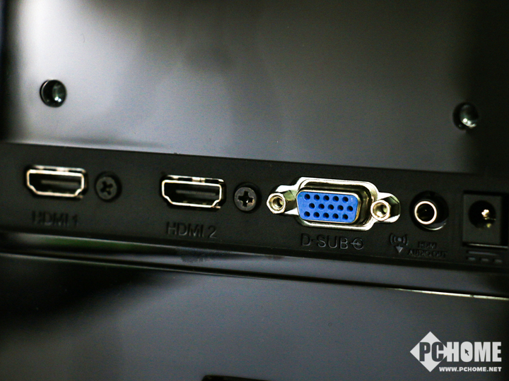 显示器背面也采用了钢琴烤漆的亮面设计,散发出隐隐的光泽感。中部还设置有四个壁挂孔位,支持背挂安装,尺寸为100mm*100mm。下方位置则是接口面板,所有孔位均为水平放置,相较于垂直向下的接口设计,连接的时候更加的方便。