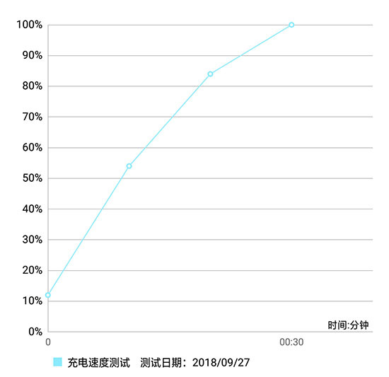 运用SuperVOOC闪充功能的OPPO R17 Pro充电极快,充电功率高达50W,在我们实际测试中,OPPO R17 Pro从12%的低电量充满至100%,总共用时30分钟,半个小时就满血复活了。