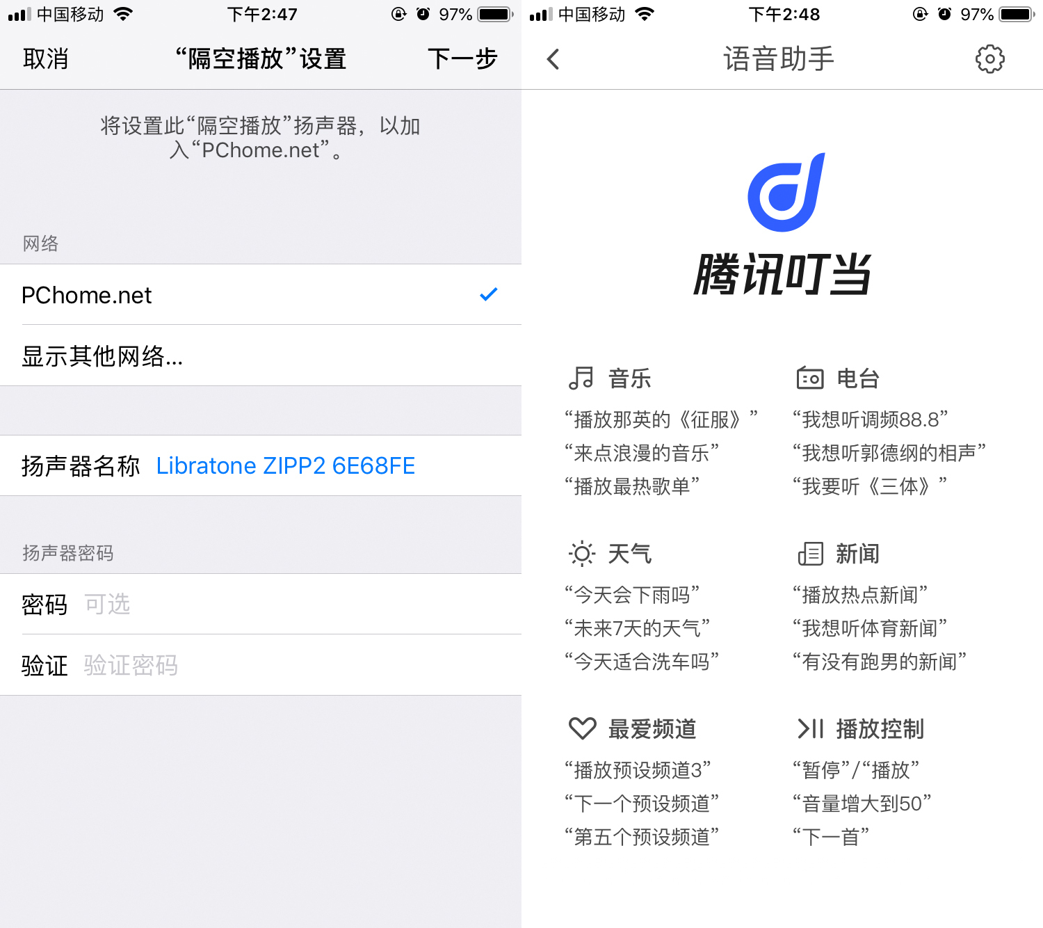 在初次使用时,用户需要下载“Libratone”App来使其连接网络。根据提示,用户在开机后需要长按音响顶部的小鸟按钮呼出六颗虚拟按键,并点击其中的连接按钮,此时App会自动搜索音响,可也在该状态下连接蓝牙。由于和iPhone进行了良好的适配,连接Wi-Fi的过程甚至不需要手动输入密码,iOS系统中的“隔空播放”功能也将同时激活。