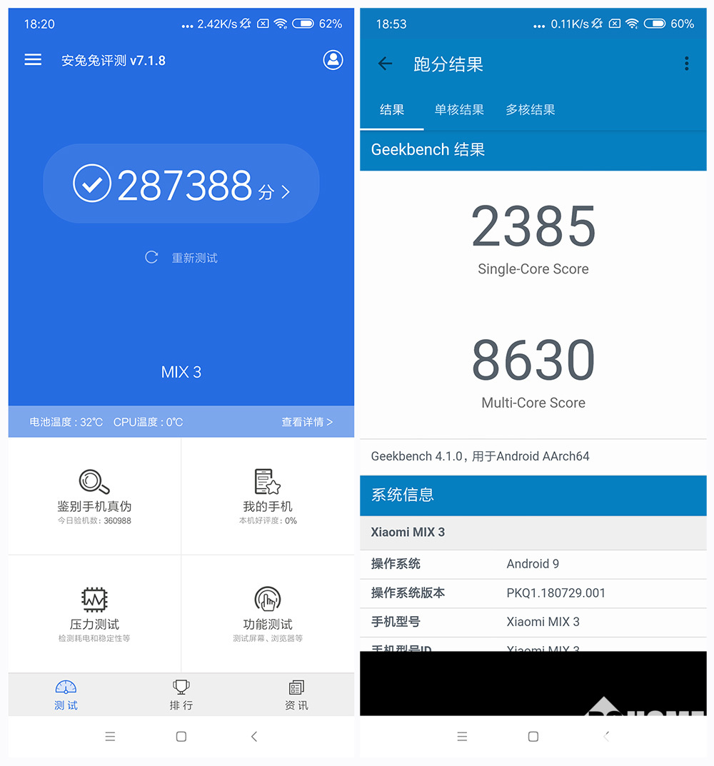 小米MIX 3这次也是毫无悬念地搭载了高通最顶级的SoC——骁龙845移动平台,但在配置方面还有惊喜,小米MIX 3的最高配内存达到了10GB大小。当然这个版本也只有故宫定制的至尊版才有,具体得等到我们拿到该版本再实测。笔者目前手中的小米MIX 3为8+256GB的版本。我们先用安兔兔和Geekbench来实测小米MIX 3的跑分情况。