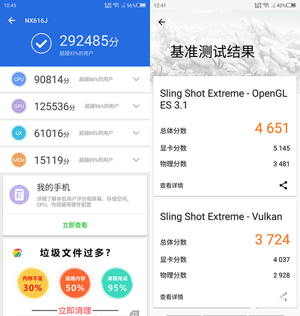 努比亚X的性能表现如何,其实我们通过几款跑分软件测试一下即可。安兔兔评测的得分接近30万分,3DMark Sling Shot Extreme的OpenGL与Vulkan得分分别为4651与3724,均属目前手机的顶级表现。