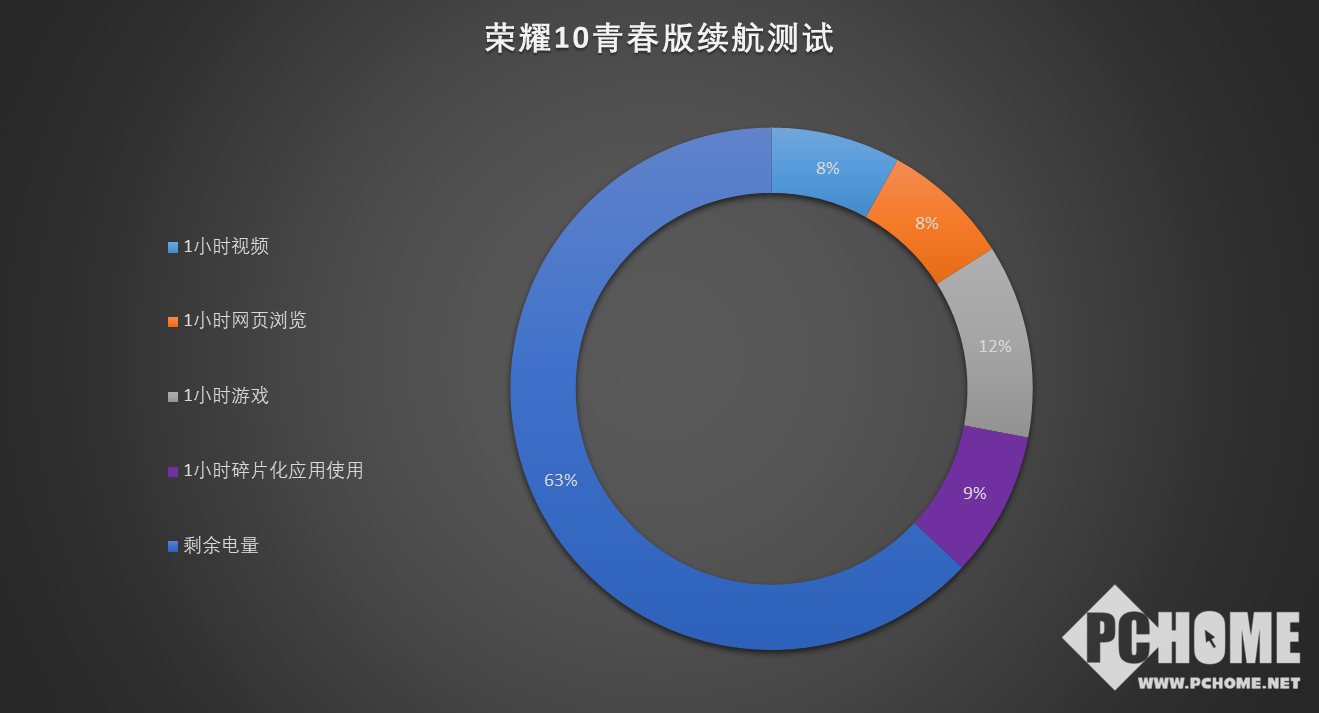 荣耀10青春版配备3400mAh电池,与麒麟710搭配有着不错的续航表现,经过我们的实际测试,该机在4小时的高强度使用后,还能够有着63%的剩余电量,撑下8小时工作后再充电毫无压力。