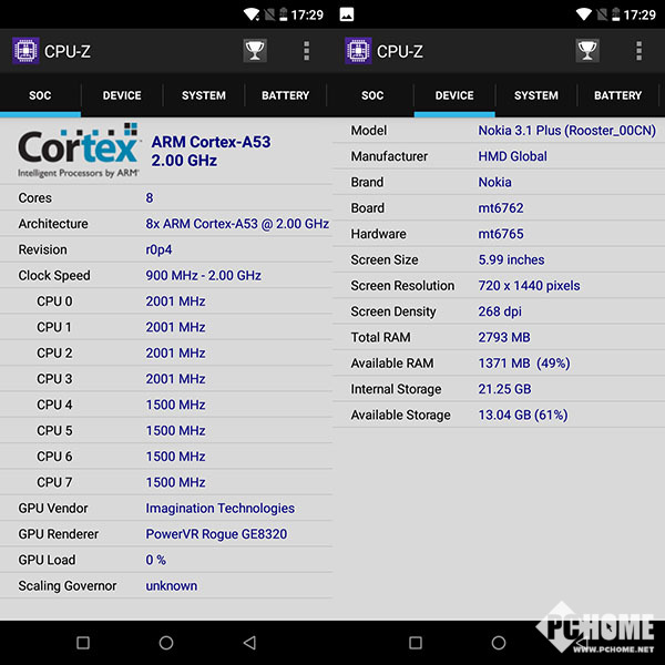 Nokia 3.1 Plus在硬件方面表现均衡,在处理器上使用联发科Helio P22八核AI处理器,这是联发科在今年5月发布的一款新品,其采用台积电12nm FinFET工艺制程,配备4个2.GHz A53+4个1.5GHz A53处理器的架构,图形方面采用PowerVR GE8329,是一款专门针对中端机型的处理器。它性能表现均衡,最突出的特色无疑就是省电了。同时其支持常见的AI框架,可以帮助手机自动调用最佳资源以便提升运行效率。