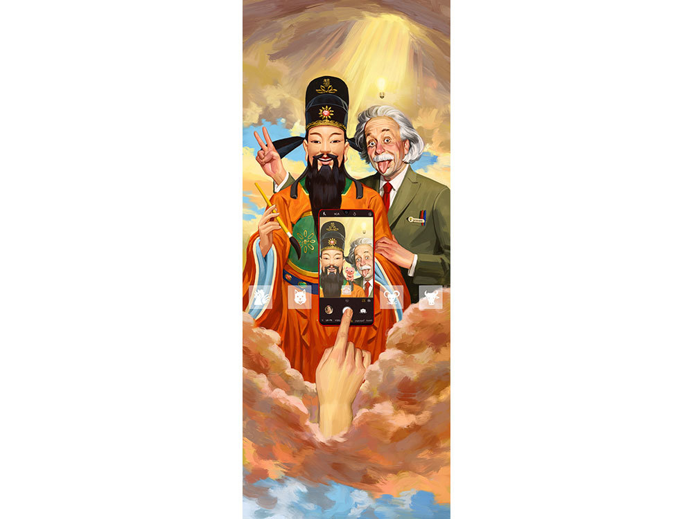 《慧》 由Ignasi Monreal创作:文曲星与天才科学家打开了Ignasi Monreal的奇思妙想:他们在OPPO奇幻电波世界里成为黄金搭档,一起做着鬼脸拍照。