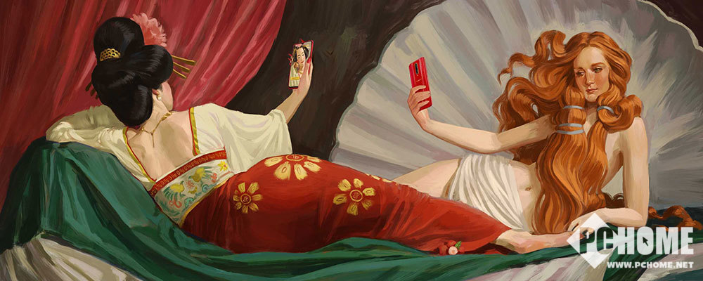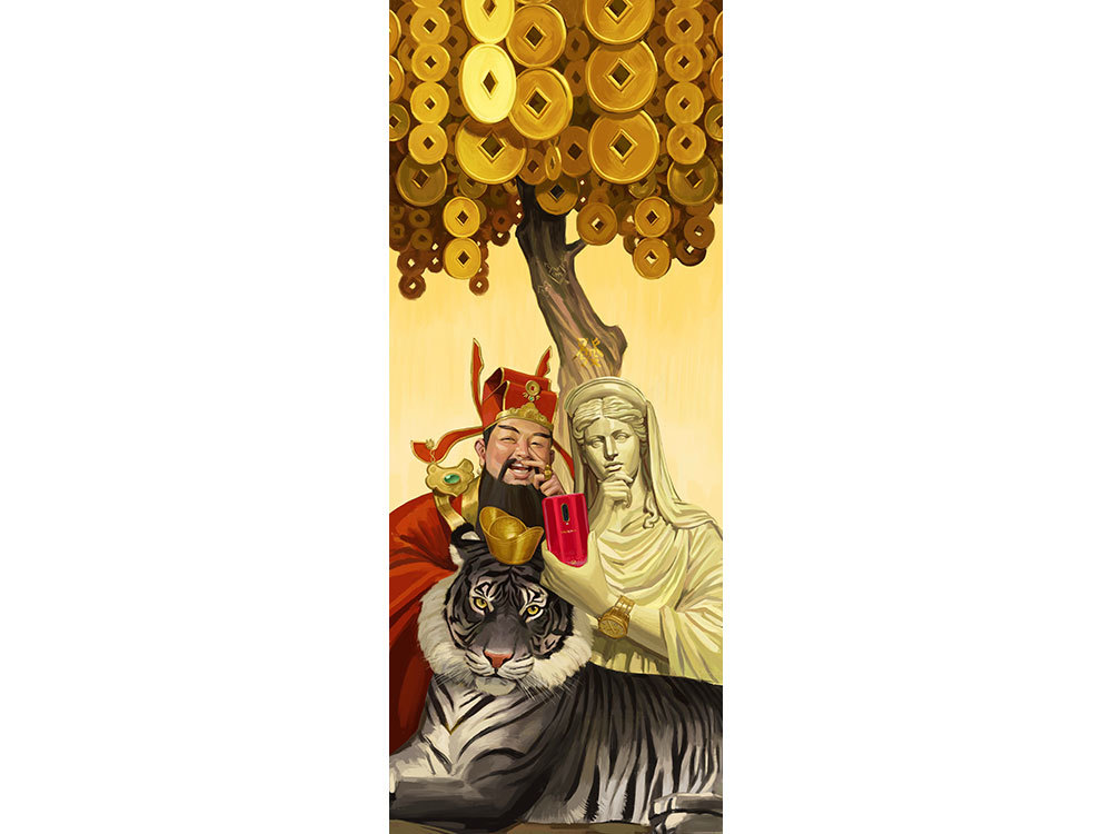 《美》 由Ignasi Monreal创作:新年新气象,每个人都希望新年更美丽帅气。Ignasi Monreal的细腻笔触勾勒出东方女神杨贵妃与珍珠小仙女维纳斯的曼妙姿态,她们正在用OPPO手机记录更美的自己。