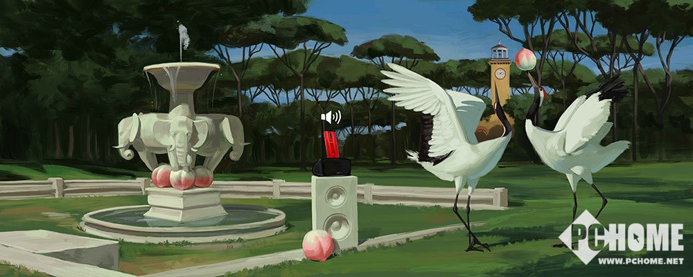 《寿》 由Ignasi Monreal创作:在种满松树的庭院里,象征吉祥的大象踏上寿桃,象征长寿的仙鹤在美妙的音乐声中跟着节奏起舞。