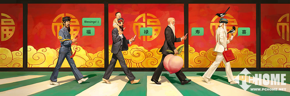 《福》由Ignasi Monreal创作:为你集齐象征福气的四大天神福、禄、寿、喜,他们像披头士一样昂首阔步地从OPPO电波世界出发。