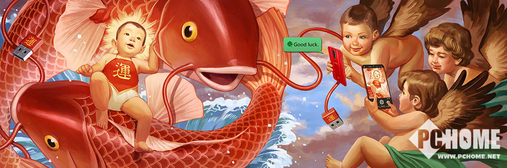 《运》 由Ignasi Monreal创作:年画娃娃骑着锦鲤送来好运,小天使纷纷飞来围观,拍照沾喜气。我们搜罗东西方各种好运符号,就为助你新的一年好运连连。