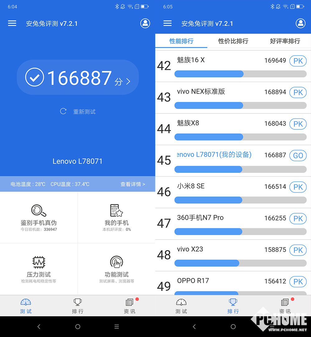用安兔兔进行测试,联想Z5s的跑分达到166887分,在安兔兔的榜单中,联想Z5s位于骁龙710机型的前列,看来联想对于骁龙处理器的优化还是可圈可点的。