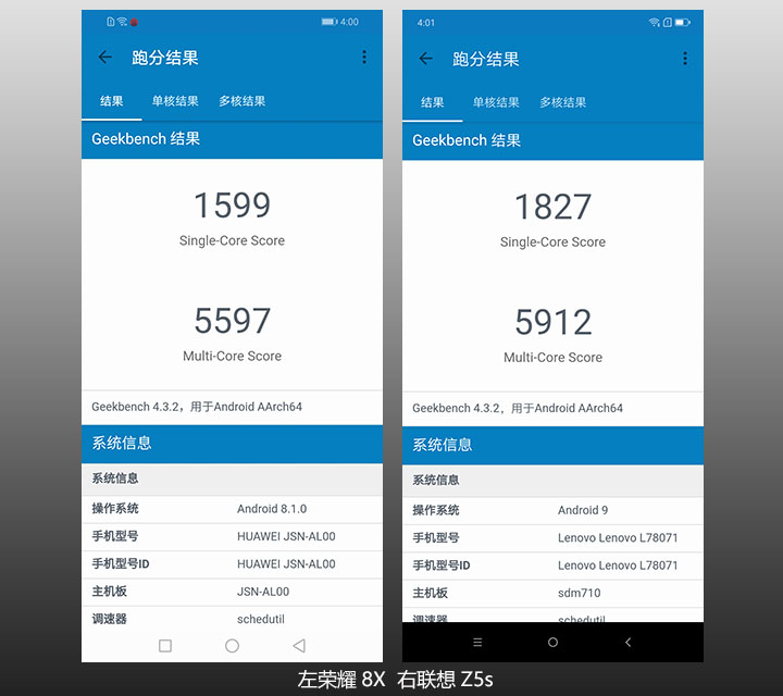 联想Z5s与荣耀8X在主要配置规格上是有很大差别的,骁龙710与麒麟710均是2018年薪推出的产品,它们的定位其实有所差距。骁龙710定位在次旗舰水准,有着先进的工艺制程,并有不少骁龙800旗舰系列下方的技术规格。麒麟710的制造工艺同样先进,不过其定位实在主流机型中,因此在绝对的性能上会有些不足。