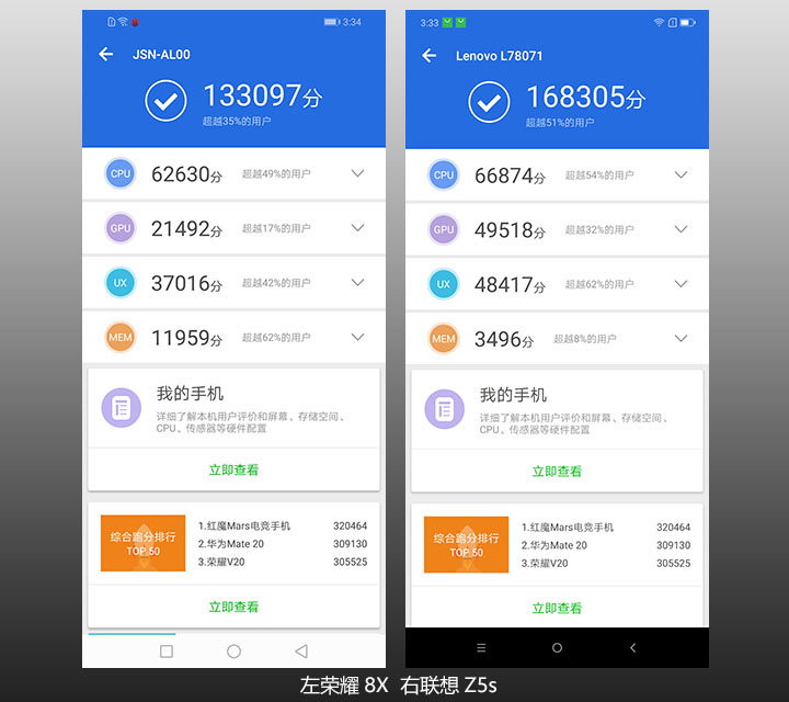 通过跑分成绩的对比之中,我们不难发现,使用高通骁龙710的联想Z5s在绝对的性能上要领先使用麒麟710的荣耀8X。当然,这里理论上的表现,我们接下来再来看看实际的游戏表现如何。
