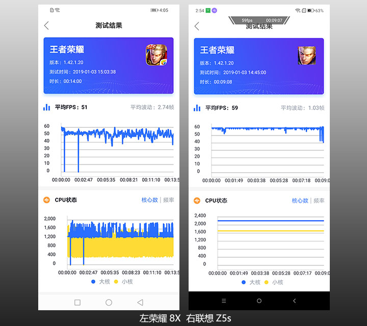 这里我们选用最流行的手机游戏《王者荣耀》来进行测试,测试中开启最高画质选项,并打开高帧率模式。通过两部手机的运行曲线我们能够看出,联想Z5s的帧率表现稳定,并且处理器的运行频率稳定,游戏稳定的跑在50帧以上的高帧率上,没有丝毫卡顿情况发生。这一方面是由于骁龙710平台强大的性能,另一方面则是联想ZUI特别的游戏加速功能,它能够为游戏预留足够的性能资源,保证游戏运行中的流畅性。相比较之下,荣耀8X的帧数波动明显,平均帧数也降低到了51帧,个别场景下的帧数已经触及到将近30帧的危险线上了。