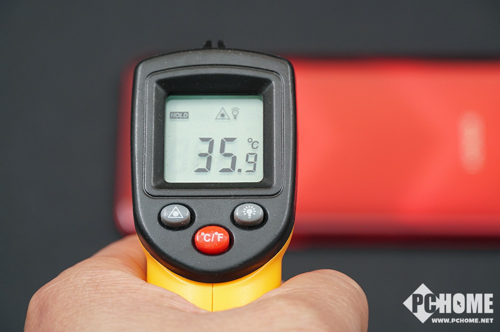 我们发现,温度最高点出现在后置指纹识别区域,最高温度约为36摄氏度,散热表现令人十分惊喜。