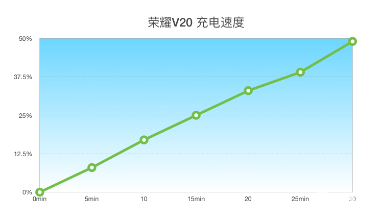 荣耀V20拥有4000mAh的大容量电池,并配备了4.5V5A的低压快充,充电时几乎不发热,并且能在30分钟内充进约50%的电量,十分可观。