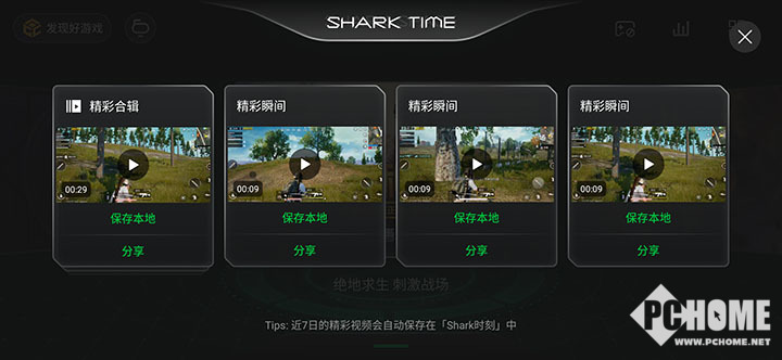在你一顿操作猛如虎过后,肯定会想将它分享出去。黑鲨游戏手机的Shark时刻功能,就能在特定游戏中(王者荣耀、刺激战场、非人学园等游戏)使用,它可以通过AI自动识别你在游戏中的高光时刻,比如在《王者荣耀》中的五杀暴走,或是吃鸡游戏中的吃鸡瞬间,系统都会进行自动的录屏操作,并可以自动生成整局游戏的巅峰精彩时刻视频,方便玩家后续的分享操作。