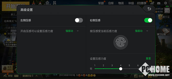 Magic Press功能借助屏幕的压感识别功能,能够将我们对屏幕的压力触控进行识别,从而实现额外的操控。以《绝地求生:刺激战场》为例,我们可以自定义两个压感识别区域,只要我们在这个区域中用力按屏幕(力度可以进行7档的自定义调节),即可在我们提前设置的小圆R区域进行点击影射。比如我们将其影射到射击按键区域,只要将准星对准敌人,而后按压屏幕即可完成开枪,比起平时的触屏操作节省了很多动作。