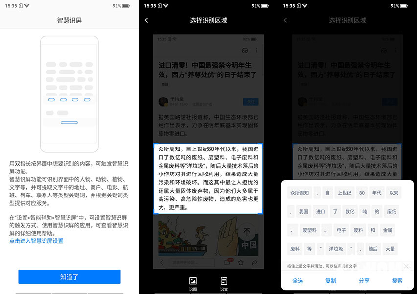 海信手机金刚5的智慧型体验还有很多,它能够对于屏幕的内容进行识别,来帮助用户快速获取文本信息,比如在网页、浏览器、信息、阅读等软件中的文字,就可以对屏幕文字进行识别,而后将文字进行分词,方便用户进行选择与复制等操作。并还能根据识别到的关键词,直接提供搜索的快捷入口。要启动屏幕识别功能,只需要双指长按屏幕即可,使用起来极为方便。