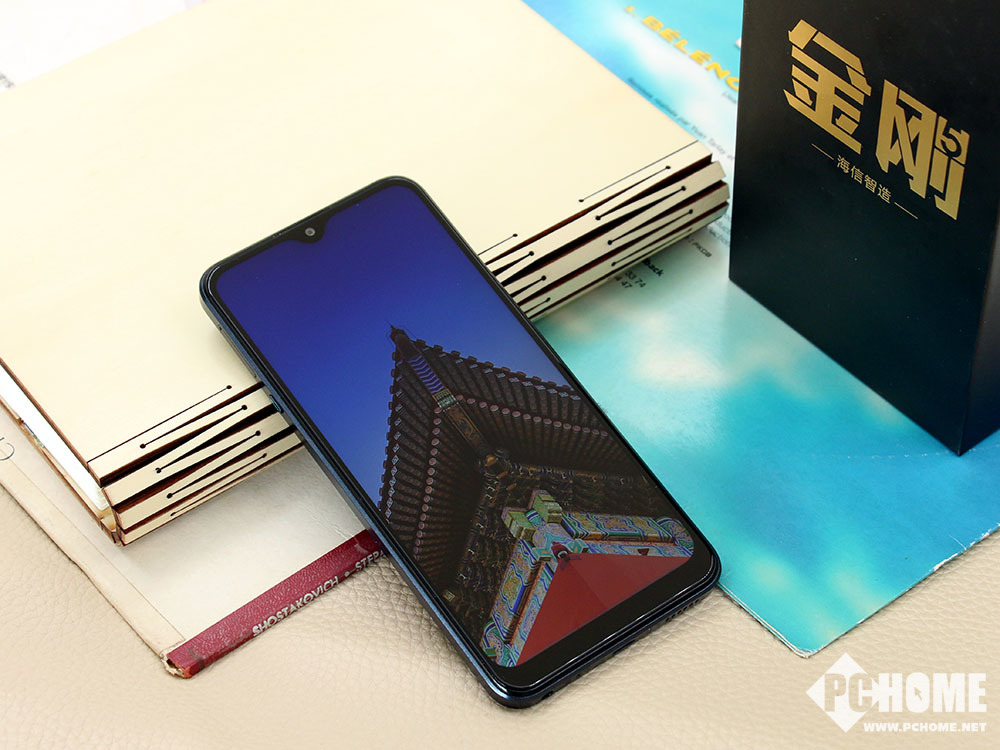 海信手机金刚5沿用了水滴屏的设计,6.22英寸的大屏幕在这种设计下有着优秀的视觉冲击力。其设计精髓就在于水滴式的前置摄像头区域,所占据的屏幕空间小,从屏幕边缘的凸起设计平滑,将这部分带来的视觉影响降到了最低。手机背部的设计上,海信手机金刚5采用了玻璃材质,其边缘有着全曲面的弧度进行过渡,背部的纹理设计给予了海信手机金刚5独特的设计感,它将机身背部分成了几大块区域,每一个区域的问题均有着不同角度的线条问题,这让整个区域就如同一个铺开的钻石一般。