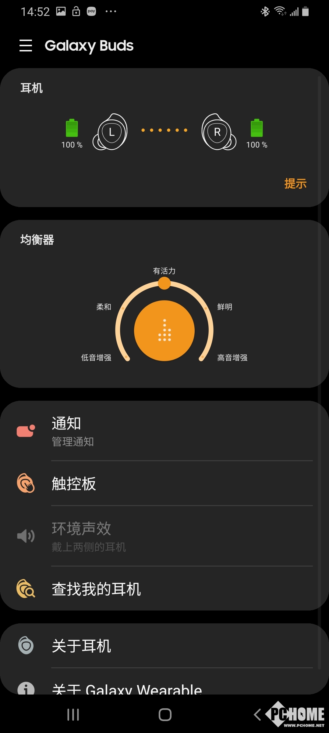 链接成功后,我们在SAMSUNG Wearable App中便可以对Buds 2019进行一些针对性的操作,比如音乐的均衡器风格、通知消息读取、触控板功能设置、环境音效以及查找耳机。