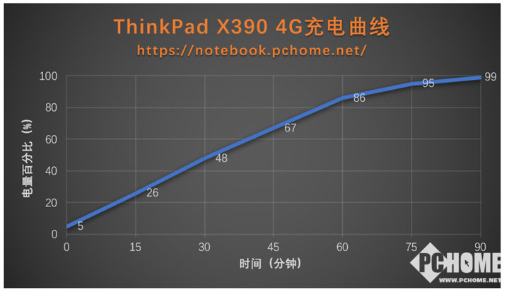 充电速度方面,ThinkPad X390 4G依然令人感到惊喜。该机标配Type-C接口充电器(65W),充电实测发现,前60分钟内的充电速度惊人,30分钟即可充进43%的电量,1个小时内即可充至86%,后程的涓流充电也仅需30分钟,90分钟内整机电量即可满血复活。超长续航时间配合快充功能,可令用户在移动办公中更有安全感。
